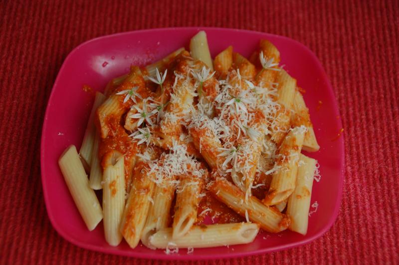 Penne rigate mit Sauce 'alla romana con ricotta', Parmesan und Bärlauchblüten