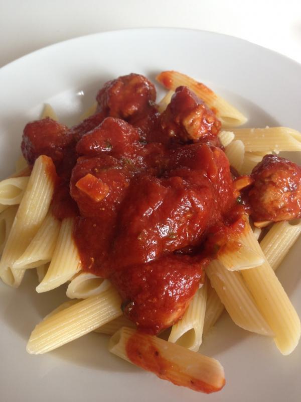 Wir hatten gestern penne und hackbällchen in Tomatensoße. Dazu Salat.