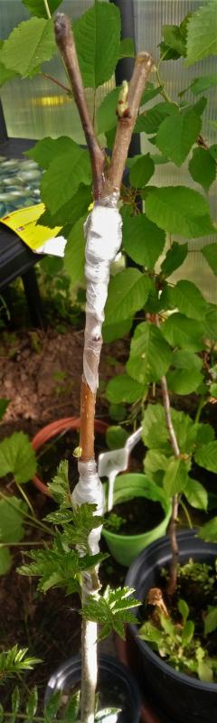 Bei solchen Versuchen, bei frühen Veredlungen und bei leicht angetriebenen Reisern benutze ich gerne Parafilm bzw. spezielle Veredlungsfilme. ZB die Crataegus pinnatifida-Reiser waren schon leicht angetrieben, Mispel und Quitenreiser machen das auch oft. Und bei den Sorbocrataegus und Sorbaronia Sorten hatte ich oft nur ein recht dünnes Edelreis, da will ich alle Chancen nutzen.