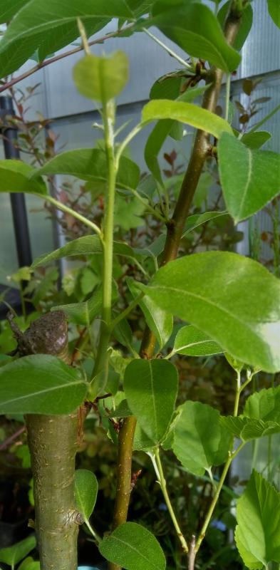 Der Haupttrieb der Birne auf Eberesche wächst auch gut vor sich hin. Momentan 8cm. an ihrer Spitze. Aufgrund einer Winterpinzierung wachsen zwei Triebe.