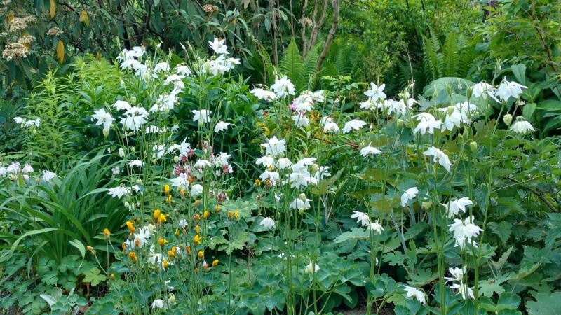 Der Gipfel ist allerdings eine reinweiße Aquilegia Caerulea! Ich sah so eine an einer Burgmauer auf einem schmalen Treppenaufgang zu einem Häuschen. Sie schwebt mir immer noch vor.