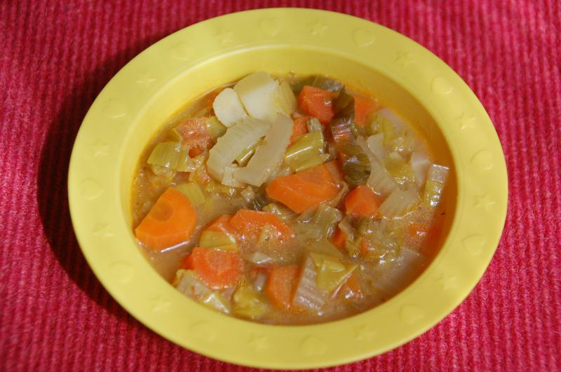 Sellerie-Möhren-Eintopf (Staudensellerie, Möhre, Kartoffel, Porree, Petersilienwurzel, Gemüsebrühe, Butter, Liebstock)