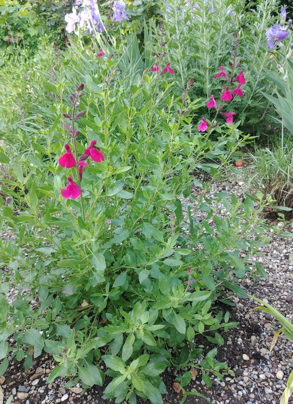 Salvia greggii 'Raspberry Royale' hat den späten Wintereinbruch (6 Tage hintereinander mit zweistelligen Minuswerten) überstanden als wäre nichts gewesen... und hat schon die ersten Blüten. Alle drei Stück zeigen sich in alter Form.