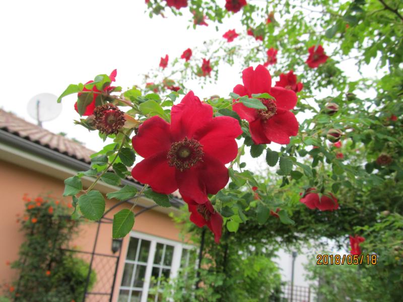 Der dauernde Regen hat auch was Gutes - heuer hängt die Rosa moyesii 'Geranium' dadurch so herunter, daß man mal etwas von den Blüten sieht: