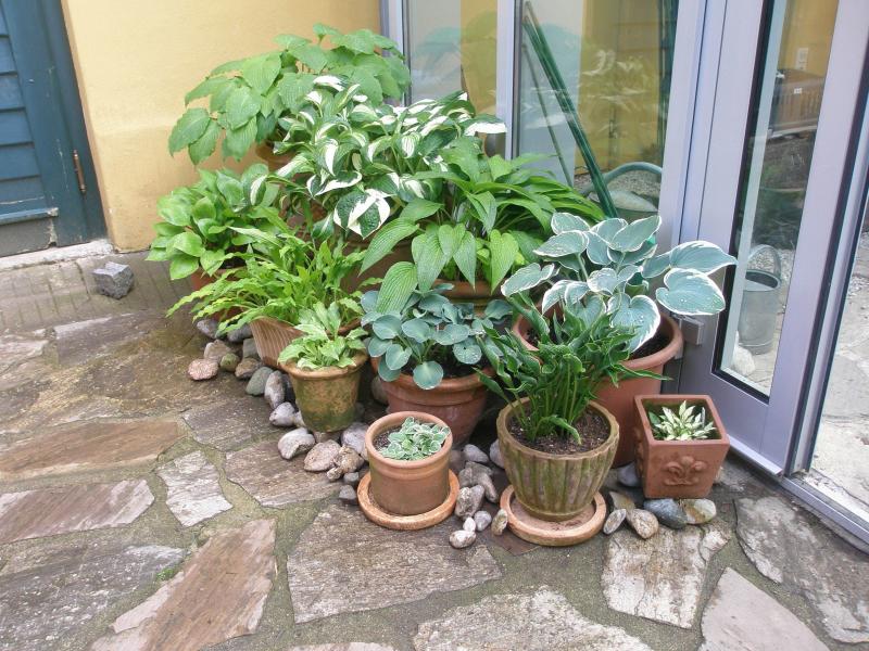 So hier meine Topfhostas, stehen nordostseitig, bekommen am Morgen Sonne, dann nicht mehr,