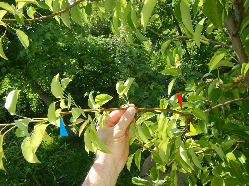 Unterm Strich lasse ich solche dünnen, kurze Triebe ungeschnitten (gelb), mit etwas Glück fruchten sie, wenn nicht machen sie nur verhalten Laub und werden manchmal komplett abgestoßen. Jedenfalls kann sowas weg.