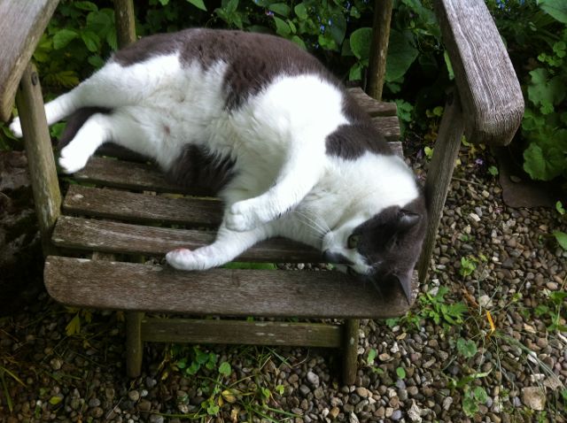 Ansonsten sitzt er z.B. auf dem Gartentisch oder lässt sich auf dem Gartenstuhl daneben um. Kraulen auf dem Bauch ist noch tabu, die Krallen sind zu spitz!