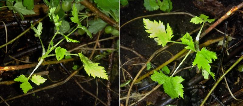 Was ich ganz interessant finde. Die unbekannte rote Sorte, bildet ab Mutterstrauch nur sehr kurze Trauben aus. Am Stämmchen sind sie aber bedeutend länger, man sieht es auf dem Foto leider nicht so gut, da die langen Trauben teils verrieselt sind. Ist das Normal? Was mir gerade noch in den Sinn kommt, vielleicht war es damals gar kein Steckholz der unbekannten roten Sorte sondern von Rovada, würde eindeutig besser zu den langen Trauben passen. Das muss ich mal genauer weiter beobachten ;)