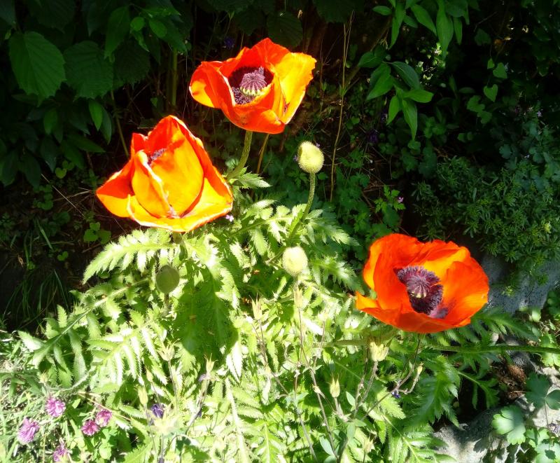 Hier haben die Mohne damit zu kämpfen, daß rundherum gedüngt wird. Sie stehen in den Staudenbeeten - auch im lichten Streuschatten (aber erst ab Mai, weil die Albizie spät austreibt). Sie haben aber drunter den schottrigen Mutterboden, bekommen keinen Dünger und auch keinen Bewässerungstropfer. Seit Jahren halten sich hier Royal Wedding, Patty's Plum und eine dunkelrote eher niedrige mit Riesenblüten (schwarze große Augenflecken). Eine pfirsichfarbene hat sich verabschiedet.