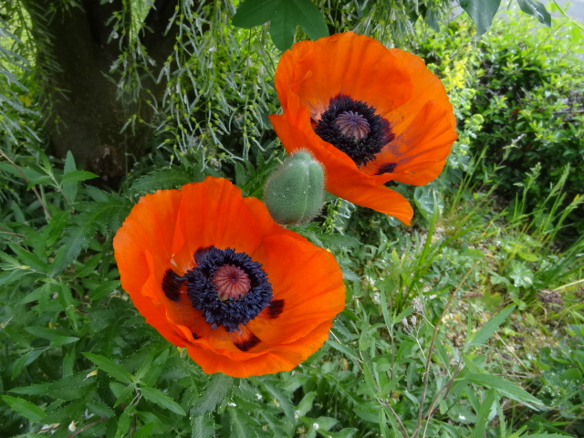Corydalis flexuosa (evtl. 'Craighton Blue'), Aquilegia vulgaris cv., Papaver bracteatum-Hybride