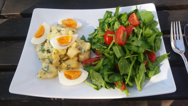 Kartoffel- Spargelsalat mit Ei und Spinatsalat mit Tomaten