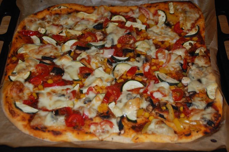 Hier gab es Pizza - gestern früh den Hefeteig mit einem Teil Vollkornmehl und gehacktem Oregano zubereitet, heute Belag aus Frühlingszwiebel, Paprika, Tomate, Mais, Zucchini, Champis, pass Tomaten, viel Oregano, S&P, Olivenöl, Gouda drauf.