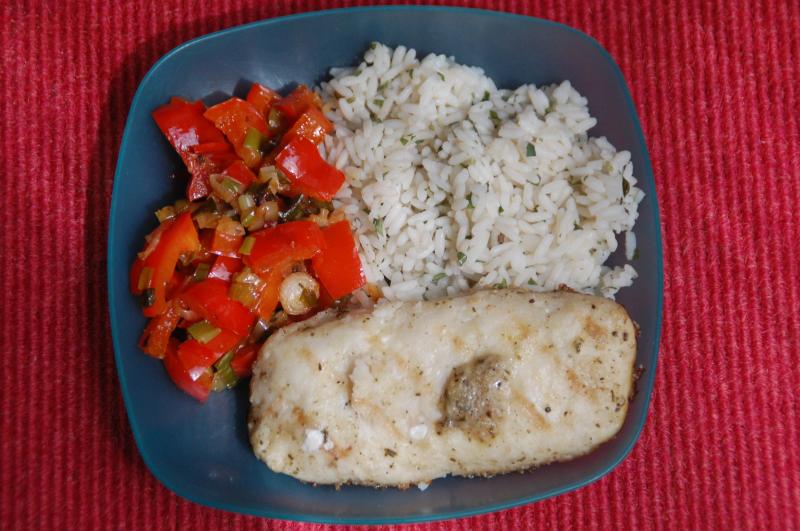 Kräuterreis (mit Mitsuba - Cryptotaenia japonica) mit Paprika-Lauchzwiebel-Gemüse und Kap-Seehecht 'Irgendwas'