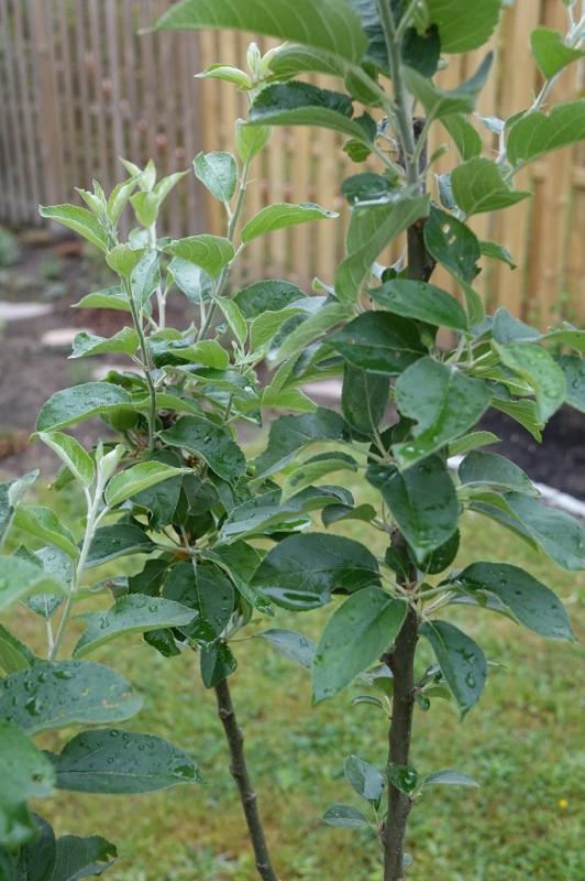 Beide Bäume haben geblüht und es haben sich an beiden Bäumen Früchte entwickelt. Die Früchte an der Alkmene habe ich abgepflückt, weil die Äste noch zu dünn sind. An der Goldparmäne hab ich 3 Früchte an einem kräftigen Ast dran gelassen um zu schauen, wie sie sich entwickeln und wie sie schmecken.