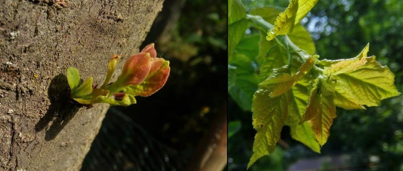 Auch die Tragblätter, also die kleinen Blättchen am Blattstiel, an der Knospe, sind unterschiedlich. Während am Baum 1 die Blätter gut entwickelt sind, sind sie am Baum 2 nicht, eher fadenförmig.
