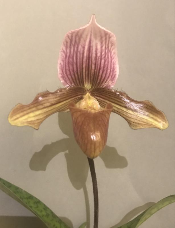 Die Hybride mit Paphiopedilum charlesworthii hat eine Blüte geöffnet. Ganz nett, aber die reine Art finde ich ausdrucksstärker.