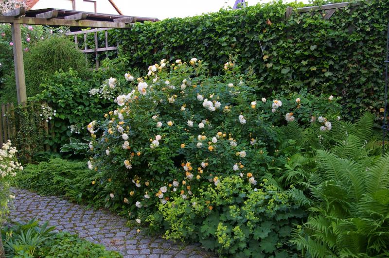 Hier duften gerade Rose Gertrude Jekyll und Lonicera japonica Halliana um die Wette.