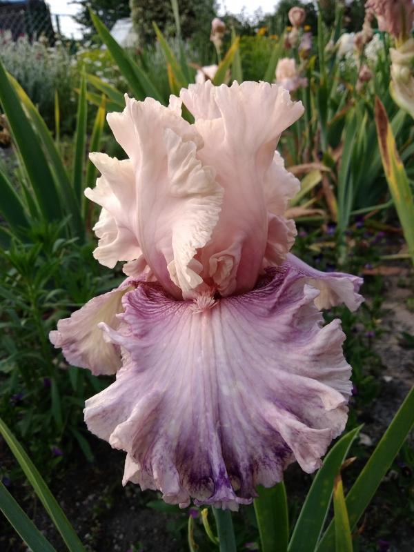 die hier ist großartig, die großartigkeit ist leider auf dem bild nur teilweise zu sehen, die blüten sind groß, die farbe des doms hat diesen pudrigen hautton, den man bei manchen taglilien sieht, zb bei sabra salina. die blütenblätter sind am rand(hab ich bis jetzt bei Iris so nicht gesehen, ist aber nciht repräsentativ, kenn nicht mehr als 80 verschiedene) gerüscht wie bei einer taglilie, die substanz sehr fest.die verlaufende farbe der hängeblätter auch speziell