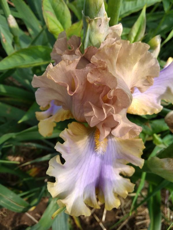 die hier ist großartig, die großartigkeit ist leider auf dem bild nur teilweise zu sehen, die blüten sind groß, die farbe des doms hat diesen pudrigen hautton, den man bei manchen taglilien sieht, zb bei sabra salina. die blütenblätter sind am rand(hab ich bis jetzt bei Iris so nicht gesehen, ist aber nciht repräsentativ, kenn nicht mehr als 80 verschiedene) gerüscht wie bei einer taglilie, die substanz sehr fest.die verlaufende farbe der hängeblätter auch speziell