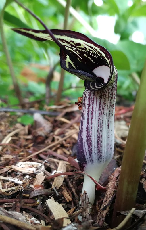 wie der in den garten kommt, weiß ich nicht. wahrscheinlich hatte ich mal beim umtopfen im herbst eine knolle übrig, die ich zum ausprobieren wo reingesteckt hatte + natürlich vergessen. das blatt hatte ich schon früher bemerkt + wollte es vor kurzem rausreißen, weil ich es für einen A. flavum hielt. zum glück hielt das blatt dem ersten versuch stand + dann sah ich auch die blüte....Arisaema kiushianum...hat erstaunlicherweise den winter im freien überstanden. hätte ich nicht unbedingt erwartet wenn man sich die lage der insel ansieht.