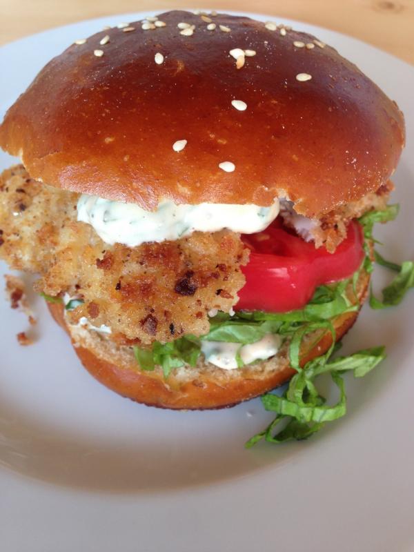 Fischburger. Heute mal in "edel" mit selbst gebackenen Laugen-Buns und eigens paniertem Fischfilet. Dazu eine Burgersoße mit vielen Gartenkräutern