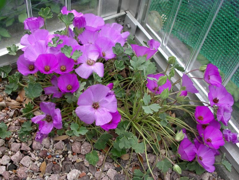 Hier auch noch was exotisches, aber viel einfacher. Tarasa humilis aus Südamerika wurde ja schon mal gezeigt. Bei mir steht die Pflanze im Alpinenhaus, wächst allerdings recht unordentlich.