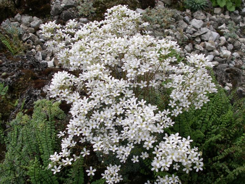 Ich habe verschiedene "krustige" Sibersaxifragas im Steingarten. Die beste Art ist aber die im Foto, deren Namen ich leider nicht mehr weis. Winzige graue Rosetten, die sich eng am Stein anschmiegen, spät und reinweiß blühend.