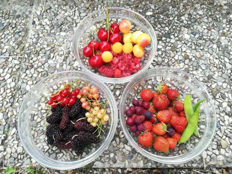 Süsskirschen (Giorgia), Felsenbirnen, Erd- und Himbeeren, Ribiseln, Maulbeeren (Illinois Everbearing) - das gibt einen leckeren Snack.