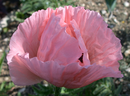 tagsüber gleichmässigbesonnt ...Er hat wunderschöne schwarzburgunderrotbräunliche Staubgefässe auf ebensolchem Grund und einen zarten gleichgefärbten Ring um die innere Mitte .Die ganze , in diesem Jahr besonders wüchsige Gruppe sieht von weitem eher ganz zartrosa aus