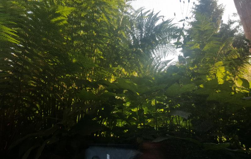 Dschungel-Blick beim Abwasch aus dem Küchenfenster (Küche im Souterrain)