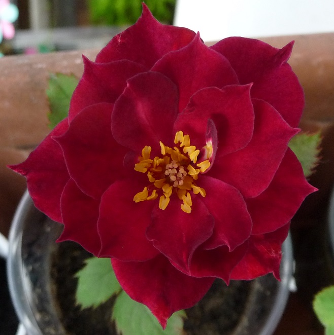 Ich habe auch dieses Jahr wieder allen möglichen Pollen von blauen und dunkelroten öfterblühenden gesunden Rosen auf die Blue for you getan und sie bildete gerade ca. 7 oder 8 Hagebutten. Ich möchte ja einerseits so etwas wie einen öfterblühenden Cardinal de Richelieu und andererseits hätte ich nichts gegen eine Rose wie Souvenir du Docteur Jamain aber gesünder. So habe ich Pollen vom Cardinal auch wieder verwendet, nachdem ich letztes Jahr traurig sehen musste, dass zwar der Cardinal nach Bestäubung einige Hagebutten mit Nüsschen produzierte, die sogar keimten, aber alle Sämlinge sind kurz nach dem Keimen einfach wieder eingegangen!! Nur ein Sämling hatte überlebt und geblüht, allerdings mit Pollen vom Cardinal auf Florence Delattre. Dieser ist dann aber im Winter erfroren. So habe ich jetzt die Blüten ziemlich zerlegen müssen um das winzige Bisschen Pollen zu finden, was ich dann vorwiegend auf Blue for you aber auch auf Reine des violettes und Parfum Flower Circus getan habe. Denn duften tut der Cardinal ja auch nicht... Aber die Farbe!!