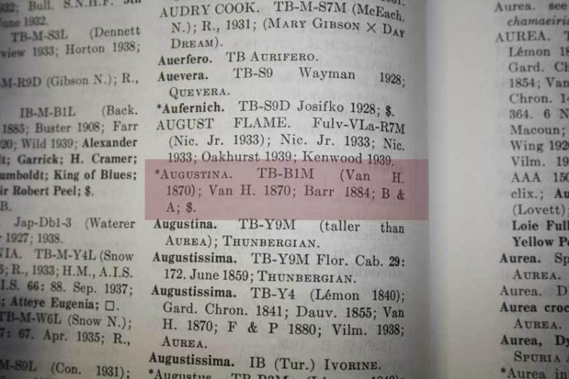 Also das ist jetzt schon ziemlich verwirrend. Ich habe hier ein Bild vom mir vorliegenden Kurzbeschrieb angehängt (American Iris Society, Alphabetical Iris Check List 1939, Ausgabe 1991, S.110). Die 'Augustina' von van Houtte ist hier als B1M beschrieben, also einfarbig mittelblau. In der Beschreibung von van Houtte aber als kupferfarben und gelb... 1min. Beitragsanzahl noch nicht erreicht 1min. Beitragsanzahl noch nicht erreicht
