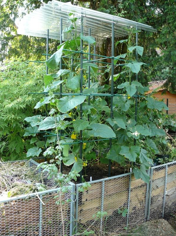 Die ersten Gurkenpflanzen haben die Dachkante erreicht. Nun bin ich gespannt,