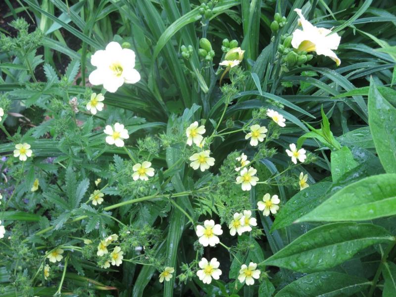 Peinlich, peinlich. Ich habe den Namen dieser Pflanze im Vordergrund total vergessen. Müsste Blatt und Blüte nach eigentlich ein Fingerkraut sein. Hat ziemlich lange Stengel, die dieses Jahr stark rumlümmeln. Die Farbe der Blüten ist goldgelb, was gestern nicht so recht rauskam.