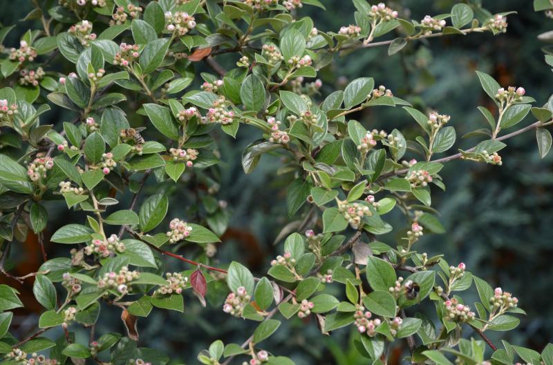 Cotoneaster franchettii blüht unscheinbar, ist aber ein Insektenmagnet!