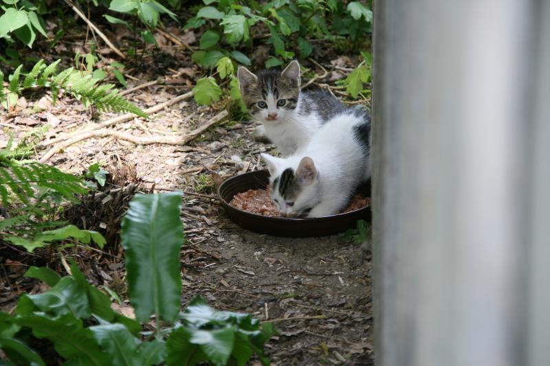 Ich habe Euch eine Story zu erzählen heute. Gestern gegen abend war ich noch im Garten und habe alles möglich abgeschnitten, das nicht mehr schön war , wie abgeblühte Rosen usw. War um meinem Schuppen rum tätig. Auf einmal sah ich was schwarzweißes, dachte erst es wäre Schnucki. Es war eine kleine Katze. Aufeinmal sah ich noch eine :D. Es waren 2 kleine Katzen. Die wuselten da rum, spielten zusammen, aber wo kamen die her. Ich ging dann hinter den Schuppen und schaute nach was da los war, sah aber nur die 2 Kleinen, sie ließen mich nicht an sich ran. Es suchte und rief auch niemand danach, es war schon so 21Uhr. Ich ging dann rein. Heute früh sah ich gleich nach. Da waren hinterm Schuppen 5 kleine Katzen zusammengerollt, aneinander gekuschelt. Ich dachte mich trifft der Schlag, gleich fünf, was mache ich jetzt denn :-\. Stellte ihnen gleich mal Milch hin, die tranken aber nicht, es war ja nur H-Milch, meine absolute Notration. Dann fuhr ich zu meiner Bauernhof-Freundin, holte dort Heu und wollte ihnen im Schuppen mit meiner Sitzbadewanne ein Nest mit Heu zur Verfügung stellen, damit sie nachts ein warmes Nest haben. Holte dort noch Milch. Ich dachte die Kleinen wurden ausgesetzt und war richtig wütend. Die Freundin beruhigte mich und meinte die Katzenmama hat sie einfach gebracht und kümmert sich um sie. Ich kam wieder heim richtete das Heunest her, stellte die gute Milch hin, sah keine Katzen mehr. Dachte schon, das Problem hat sich von selbst gelöst. Dann einer Weile sah ich wieder nach, da kam mir die Katzenmama fauchend entgegen. Ich habe sie gleich mit Worten beruhigt und ging gleich wieder rückwärts aus dem Versteck weg. Später habe ich wieder nachgesehen, da lag sie dort und säugte ihre 5 Kleinen. Sieh schaute mich ganz forsch an, ich ging gleich wieder rückwärts und beruhigte sie wieder mit der Stimme. Jetzt bin ich richtig beruhigt, das sich eine Mama um sie kümmert und hoffe ja, daß sie nur auf Lehrtrip (Durchreise) ist mit ihnen. Bin ja gespannt wie es weiter geht. Habe von weiten 2 Fotos gemacht.