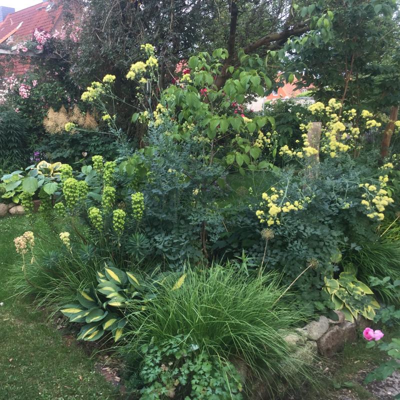 Besonders liebe ich dieses talictrum. Eigentlich etwas zu hoch an der Stelle, aber da es so schön luftig wächst darf es bleiben. Zudem ist das Laub vor und nach der Blüte total schön grau-Grün-blau und gefällt mir auch ohne Blüte