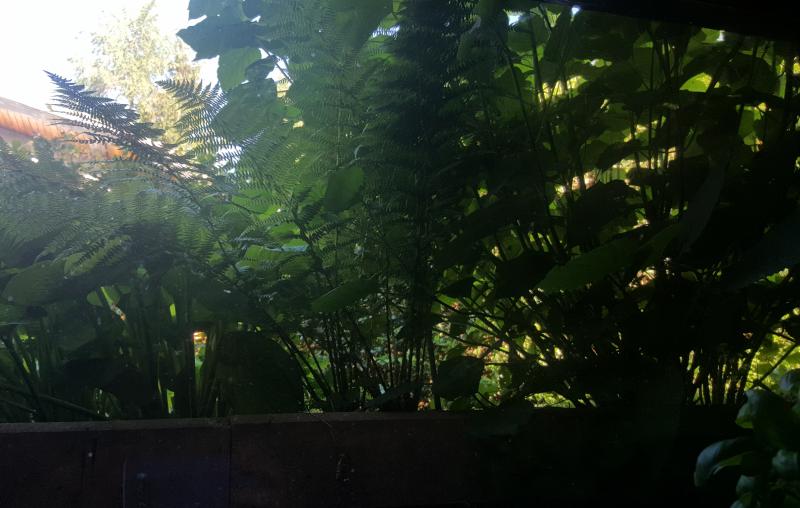 Dschungel-Blick beim Abwasch aus dem Küchenfenster (Küche im Souterrain)