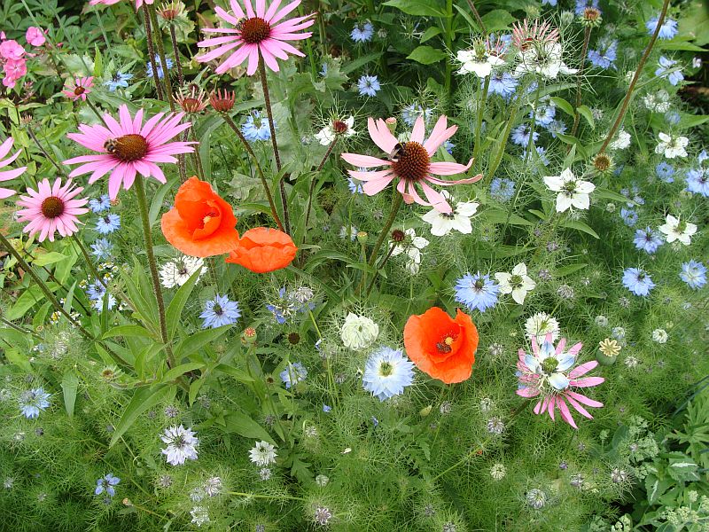 Den normalen leicht orangeroten Mohn, wie man ihn (jedenfalls beim Biobauern) im Kornfeld findet, finde ich im Garten nicht schön, da der Farbton oft nicht zu anderen rot oder blau blühenden Pflanzen passt.