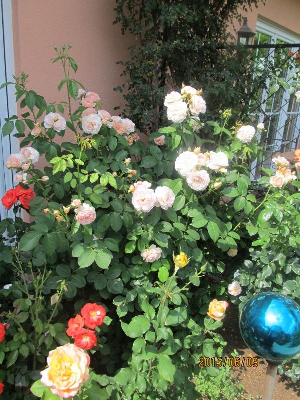 Die restlichen Austins hier sind spezieller - muß man drauf stehen, z. B. The Pilgrim (wächst gut, kann auch klettern, mieft aber nach Mottenkugeln - pardon 'Weihrauch'), Fisherman's Friend ist ein Stachelmonster, Sharifa Asma hier traumhaft schön und von der Größe her sicher gut geeignet für einen Topf, Jude The Obscure hat kugelförmige Blüte und einen unglaublichen Duft, ist aber verhalten im Wuchs,....