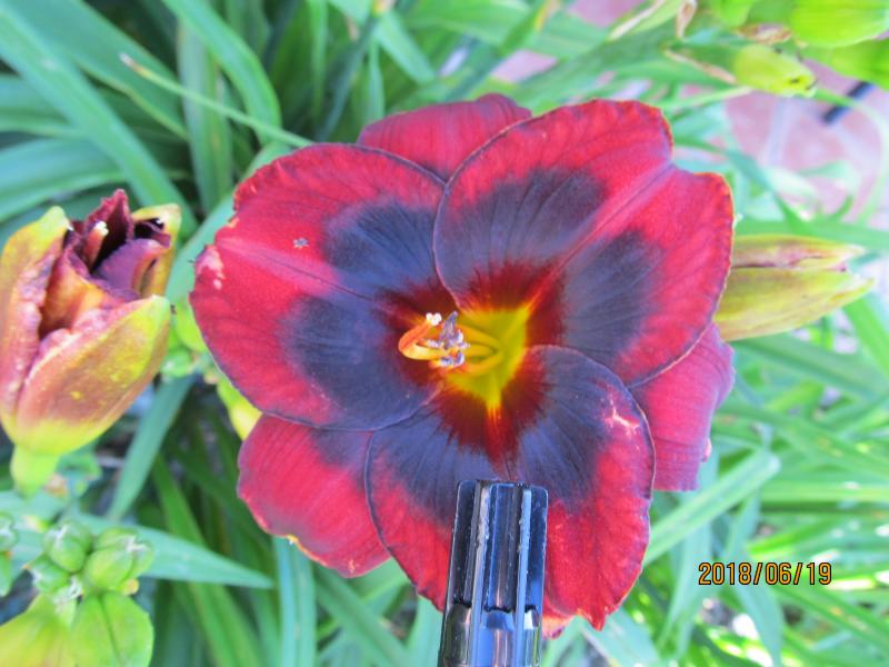 Das absolut schwärzeste Taglilienschwarz hat hier das Auge von Spacecoast Devil's Eye - so dunkel ist keine der einfarbigen Sorten, der Farbton schimmert live bläulich:
