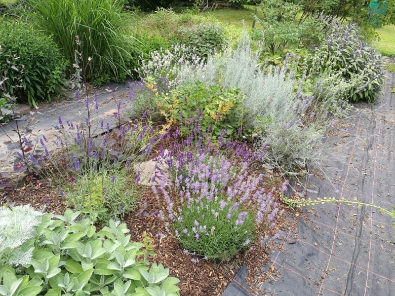 Als Lavendelbegleiter zu sehen: Salvia Berggarten, Artemisia Powis Castle, Artemisia abrotanum Silver, Salvia atropurpurea, Marrubium und ganz weit hinten Salvia Icterina.