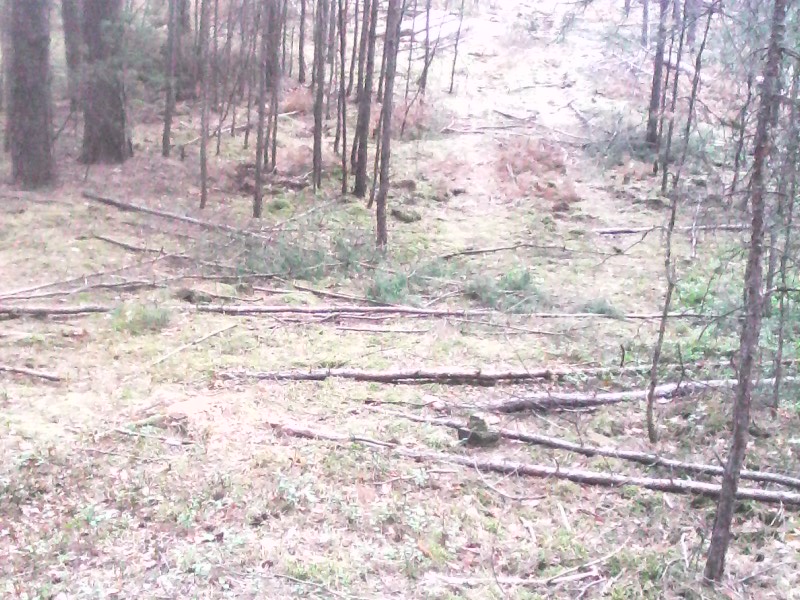 Die haben durch ein benachbartes am Weg gelegenes Waldstück zwei Schneisen durchs Unterholz gezogen und forstwirtschaftlich offensichtlich wertloses Stangenholz einfach umgesägt. :-X und Spuren ins Gelände gefahren.