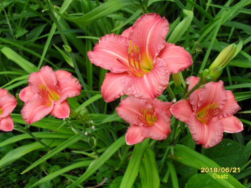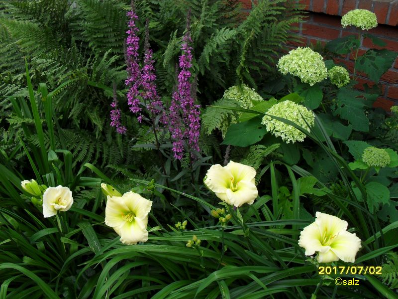 Der Farbwunsch ist schon schwieriger - viele 'rosa' Taglilien neigen zu warmen Farbtönen ('Schnitzelfarben' - stell Dir ein Putenschnitzel vor ;)). Diese Neigung wird durch vollsonnige Pflanzung verstärkt. Viele 'weiße' Taglilien neigen zu gelben Farbtönen - ebenfalls bei vollsonniger Pflanzung und Hitze, zusätzlich zeigen die Blütenblätter häufig schon am Nachmittag 'Auflösungserscheinungen'.