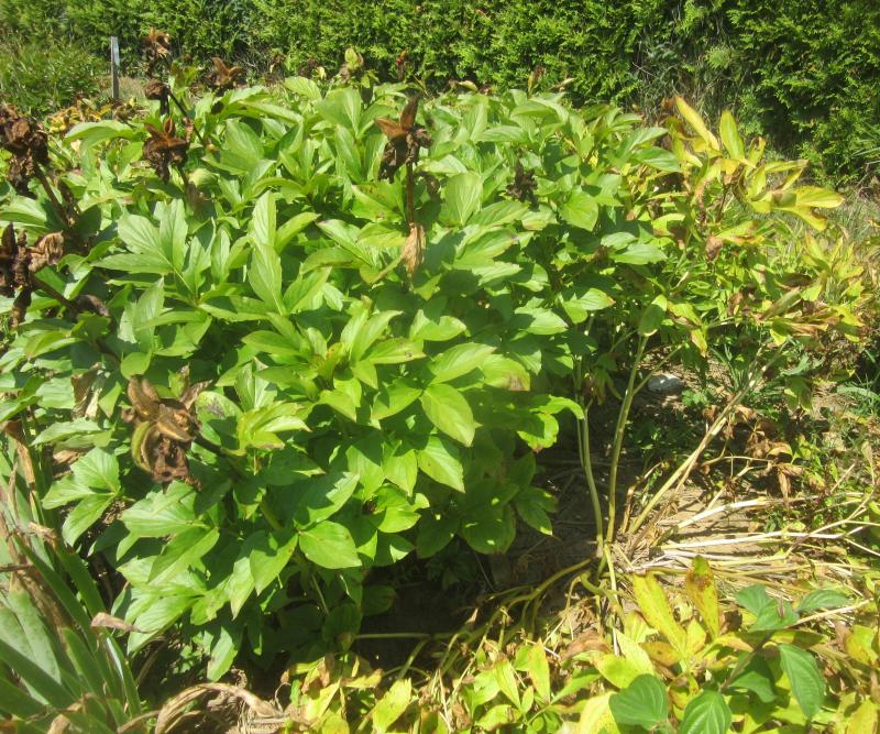 Staudige Paeonien färben zum Teil rot, bevor sich die Triebe auf den Boden legen. Ich vermute, die stehen nimmer auf.