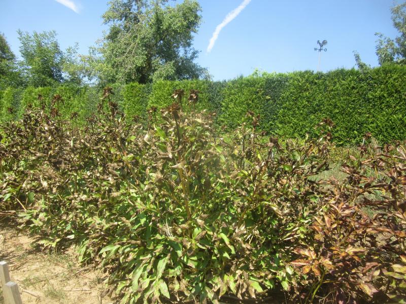 Hier ist eine der momentan noch wirklich frischgrünen Pfingstrosen der indirekte Peregrina-Abkömmling `Paula Fay´. In der Blüte fast peinlich, aber momentan wirklich gut dastehend! Rechts daneben liegt `Opalfeuer´ schon seit kurz nach der Knospenbildung auf dem Boden, ist natürlich das genaue Gegenteil.