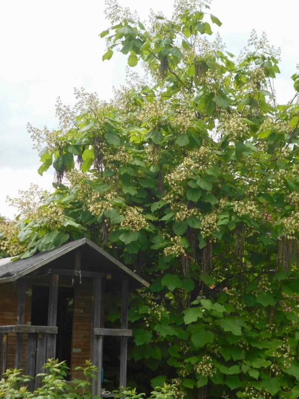 Die von mir vor Jahren gesetzte Catalpa fargesii v. duclouxii blüht gerade nebem dem Stelzenhaus: