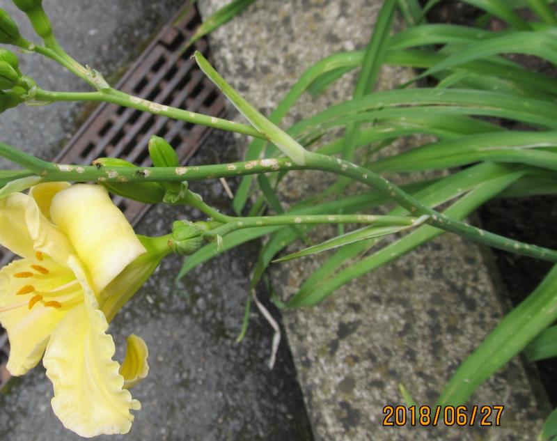 Zu den Witterungsschäden - so sehen aktuell die Stängel aller Taglilien aus, die keinen Schutz durch Gehölze oder hohe Stauden hatten - übersät mit kleinen 'Mecken' verursacht durch die Hagelkörner: