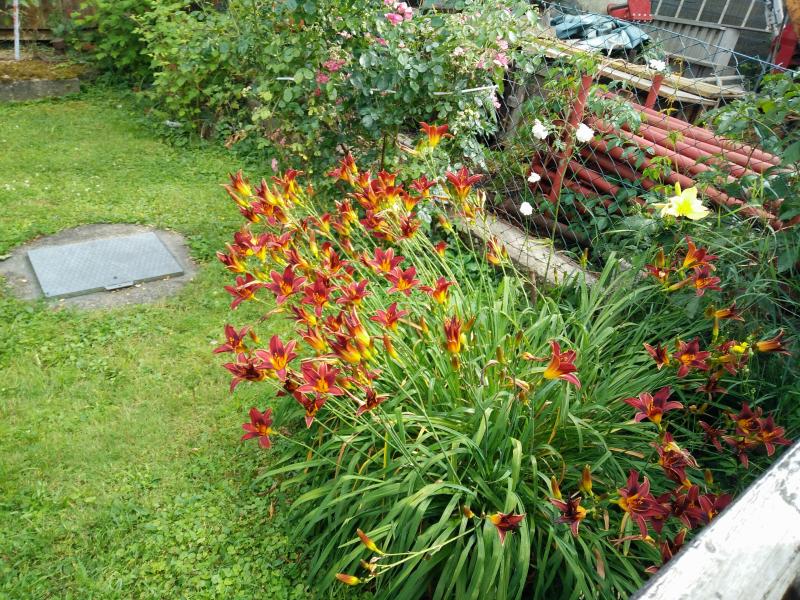 Falls jemandnach dem Blütenrausch aus dem Lord-Garten noch ein wenig Kapazität übrig hat bitte ich um Identifizierungshilfe. Neben unserem Gemüsegarten steht in einem ebenso alten Garten eine riesiger Taglilienhorst. Die Besitzerin kennt keinen Sortennamen (und wenn sie ihn mal wußte, hat sie ihn schon vor Jahrzehnten vergessen ;)) - die überreiche Blüte finde ich interessant und mich wundert, daß ich diese Sorte noch niemals irgendwo gesehen hab.