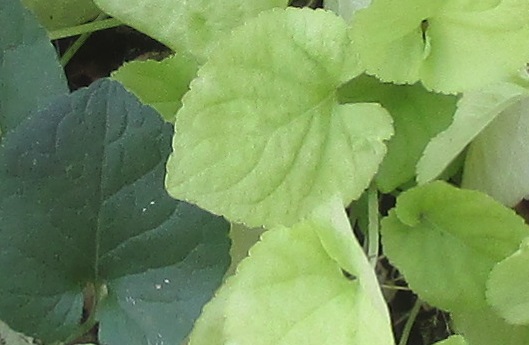 Ich suche seit einigen Tagen die Ursache für sehr helles Veilchenlaub, es ist fast gelblich. Dünger fehlt in dem Beet nicht, denn die Pelargonium zonale haben sehr kräftig grünes, gesundes Laub und sind sehr gut wüchsig und blühfreudig.